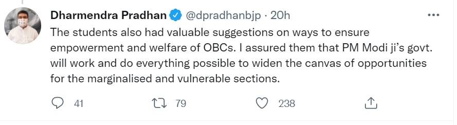 The OBC community thanked Union Education Minister Dharmendra Pradhan for approving 27 per cent of reservations in the medical entrance exam NEET.