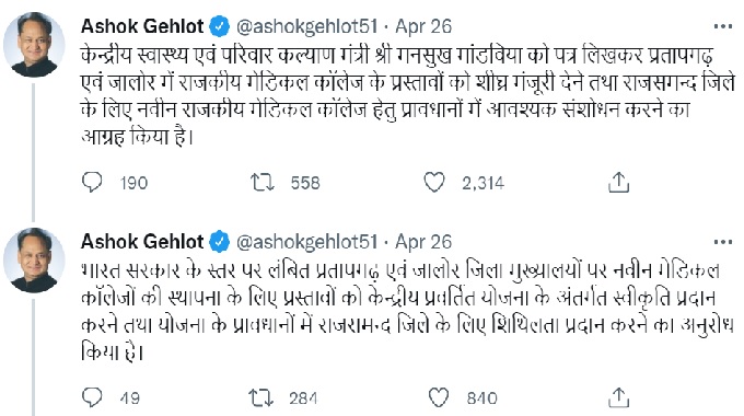 Ashok Gehlot's tweet reads, "By writing a letter to the Union Health and Family Welfare Minister Mansukh Mandaviya, urged him to approve the proposals of Government Medical Colleges at Pratapgarh and Jalore at the earliest and make necessary amendments in the provisions for new Government Medical Colleges for Rajsamand district."