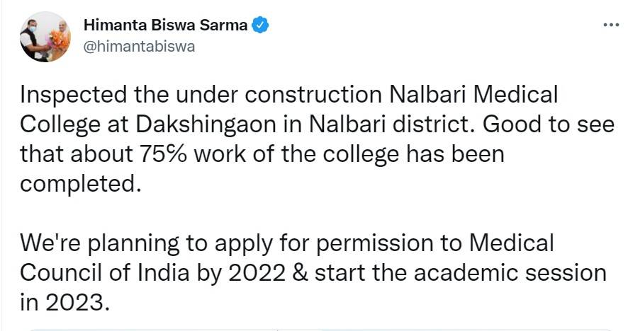 Himanta Biswa Sarma tweet reads, "Inspected the under construction Nalbari Medical College at Dakshingaon in Nalbari district. Good to see that about 75℅ work of the college has been completed. We're planning to apply for permission to Medical Council of India by 2022 & start the academic session in 2023."