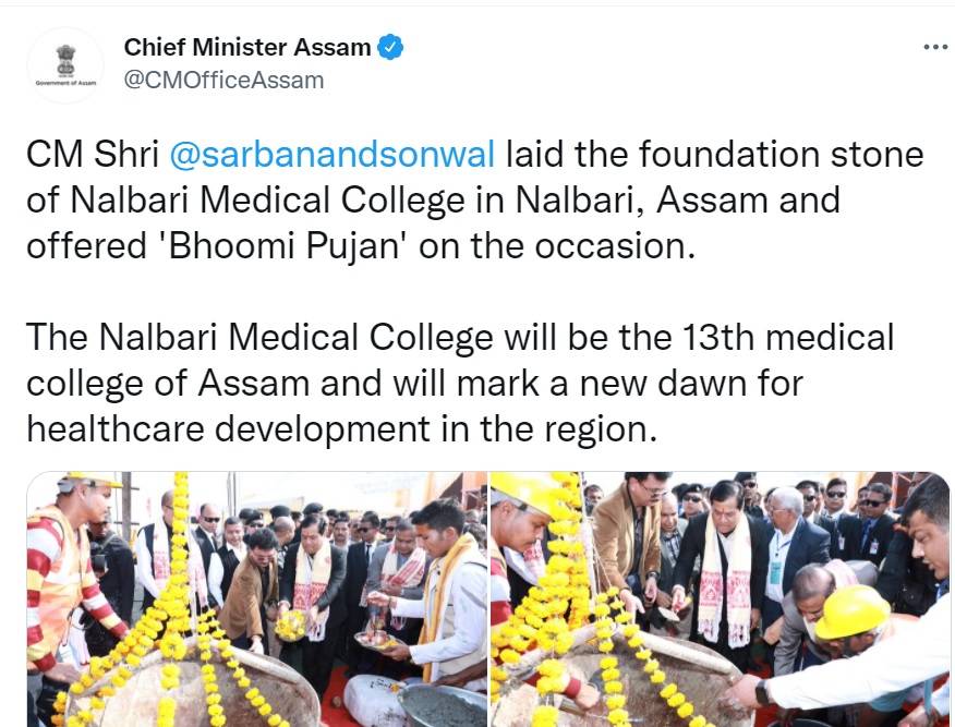 Chief Minister Assam official tweet on January 27, 2019, says, "CM Shri @sarbanandsonwal laid the foundation stone of Nalbari Medical College in Nalbari, Assam and offered 'Bhoomi Pujan' on the occasion. The Nalbari Medical College will be the 13th medical college of Assam and will mark a new dawn for healthcare development in the region."