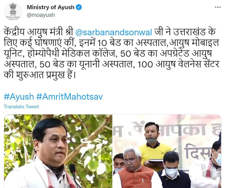 Ministry of Ayush tweet reads, "Union Minister of AYUSH Sarbananda Sonowal announced many projects for Uttarakhand including 10-bed hospital, AYUSH mobile unit, Homeopathy medical colleges, 50 bed upgraded Ayush hospital, 50-bed Unani hospital and 100 Ayush wellness centre."
