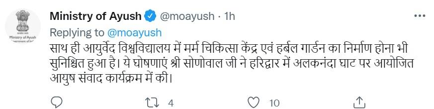 Another tweet by the Ministry of Ayush says, "Also, Ayurveda University will get marm treatment centre and herbal gardens will be created. These announcements were made by Sarbananda Sonowal in Haridwar Alaknanda Ghat during the AYUSH Samvaad program."