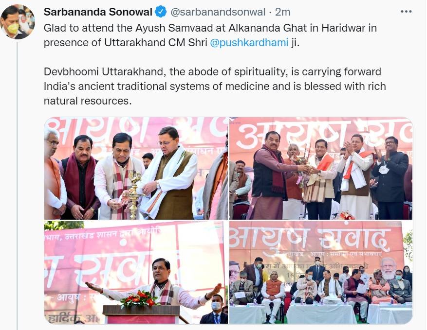 Sarbananda Sonowal tweet says, "Glad to attend the Ayush Samvaad at Alkananda Ghat in Haridwar in presence of Uttarakhand CM Shri @pushkardhami ji. Devbhoomi Uttarakhand, the abode of spirituality, is carrying forward India's ancient traditional systems of medicine and is blessed with rich natural resources."