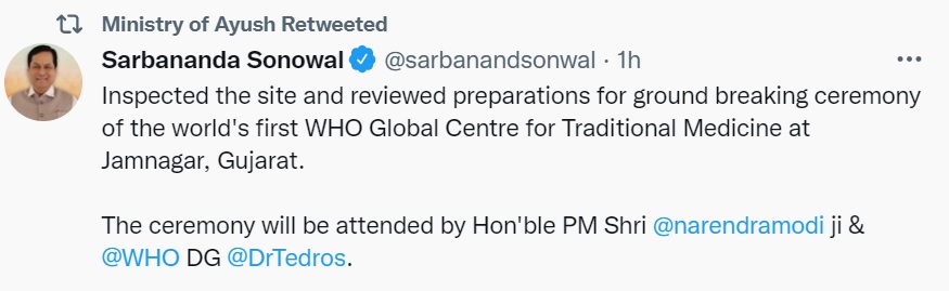 Sarbananda Sonowal's tweet reads, "Inspected the site and reviewed preparations for ground breaking ceremony of the world's first WHO Global Centre for Traditional Medicine at Jamnagar, Gujarat. The ceremony will be attended by Hon'ble PM Shri @narendramodi ji & @WHO DG @DrTedros."