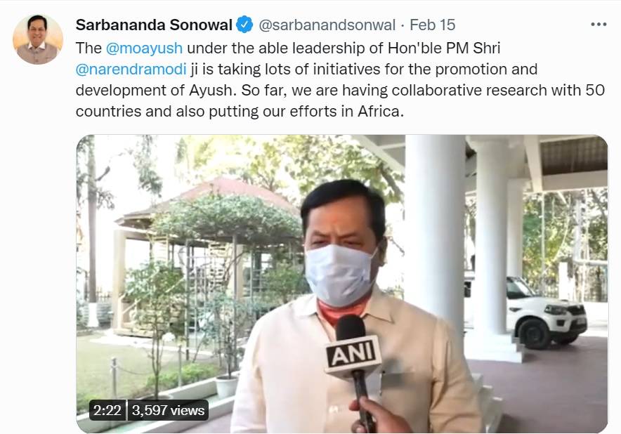 Union Minister of AYUSH Sarbananda Sonowal has tweeted, "The @moayush under the able leadership of Hon'ble PM Shri @narendramodi ji is taking lots of initiatives for the promotion and development of Ayush. So far, we are having collaborative research with 50 countries and also putting our efforts in Africa."