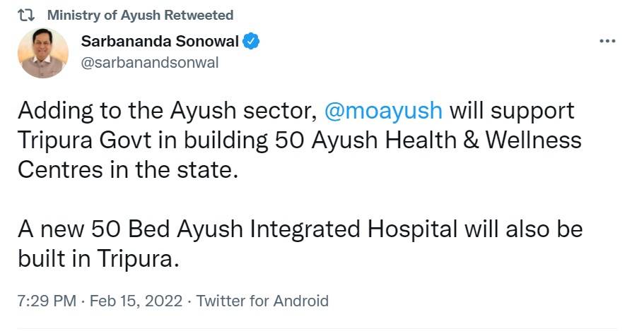 Sarbananda Sonowal had tweeted, "Adding to the Ayush sector, @moayush will support Tripura Govt in building 50 Ayush Health & Wellness Centres in the state. A new 50 Bed Ayush Integrated Hospital will also be built in Tripura."