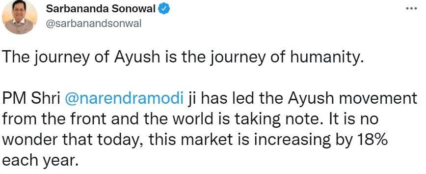 He had tweeted "The journey of Ayush is the journey of humanity. PM Shri @narendramodi ji has led the Ayush movement from the front and the world is taking note. It is no wonder that today, this market is increasing by 18% each year."