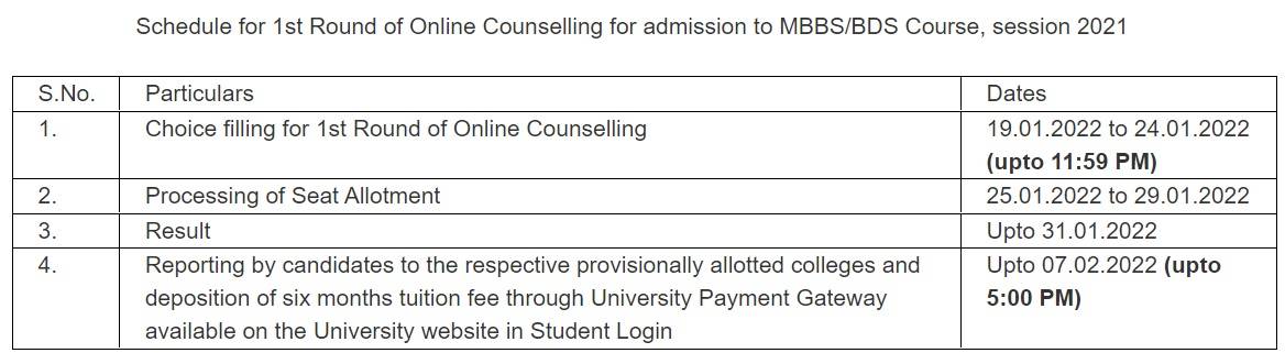 As per Round 1 of the online counselling schedule released on the BFUHS official website, choice filling for the first round of online counselling can be done between January 19 to January 24 up to 11:59 pm. Processing of seat allotment is scheduled between January 25 to go January 29, and seat allotment results will be out by up to January 31.