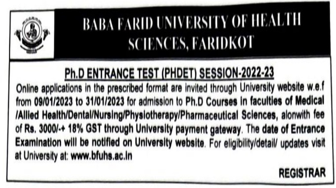 Candidates who seek to appear in the PhD Entrance Test (PHDET) Session - 2022-23 of BFUHS, must apply by January 31, 2023.