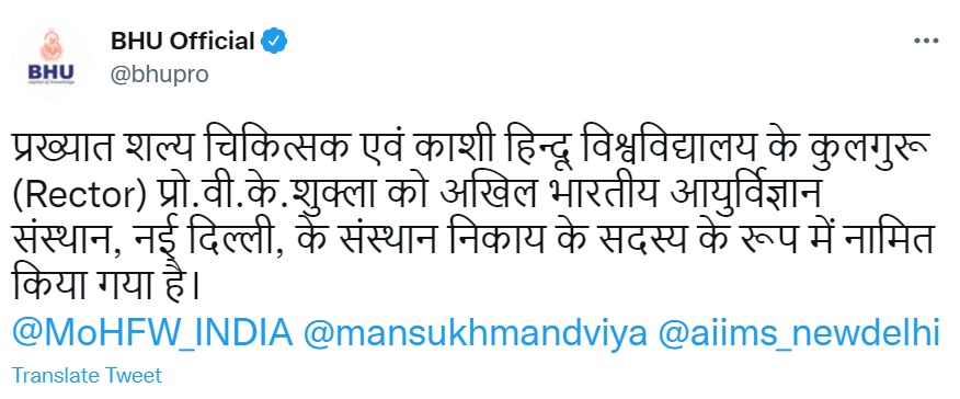 BHU official tweet reads, "Eminent Surgeon and Rector of Banaras Hindu University, Prof VK Shukla has been nominated as a member of the Institute Body of All India Institute of Medical Sciences, New Delhi."