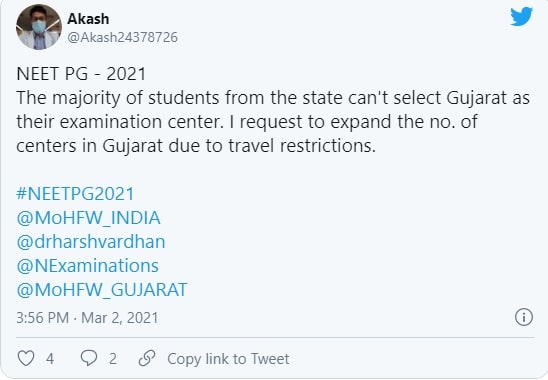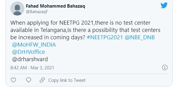 “When applying for NEET PG 2021, there is no test center available in Telangana, is there a possibility that test centers be increased in coming days?” a candidate complained.
