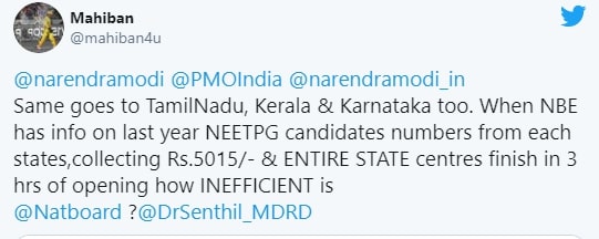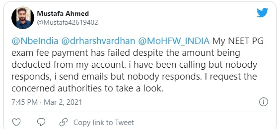 One of the candidates expressed disappointment over an error in fee payment as well. “My NEET PG exam fee payment has failed despite the amount being deducted from my account. I have been calling but nobody responds, I send emails but nobody responds. I request the concerned authorities to take a look,” a candidate posed on his Twitter account.