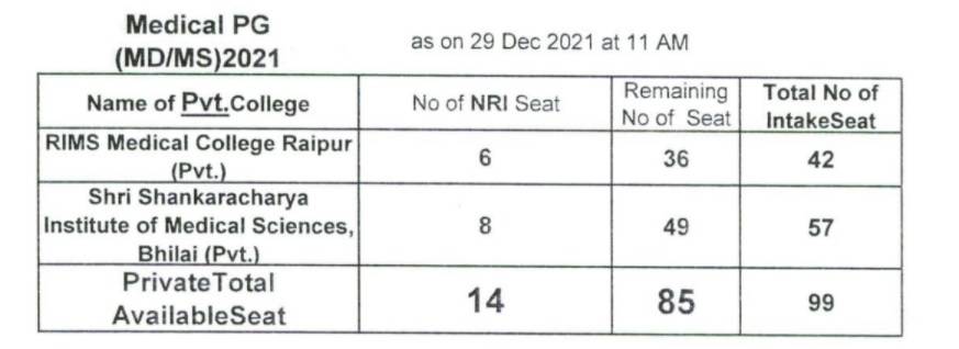 As far as private medical colleges are concerned, out of 99 seats, 42 seats are available in RIMS Medical College Raipur, 57 seats are available in Shri Shankaracharya Institute of Medical Sciences, Bhilai. 14 out of these 99 seats are for Non-Resident Indian (NRI) candidates.