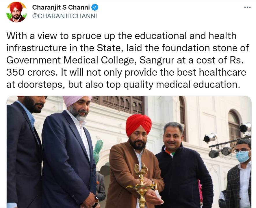 Chief Minister Channi's tweet reads, "With a view to spruce up the educational and health infrastructure in the State, laid the foundation stone of Government Medical College, Sangrur at a cost of Rs. 350 crores. It will not only provide the best healthcare at doorsteps, but also top quality medical education."
