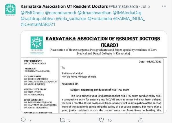 The Karnataka Association of Resident Doctors(KARD) has written to Prime Minister Narendra Modi regarding NEET PG 202`1 exam. In a letter dated July 5, the association has requested Prime Minister to conduct the exam as soon as possible as the situation is now conducive for the NEET PG 2021 exam due to declining cases of covid-19. The Resident Doctors Association said that NEET PG 2021 exam is the only way to increase the manpower and make the country better prepared to tackle the third wave of the corona.