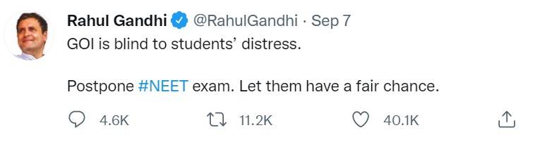 Indian National Congress has lend support to students' demand to postpone NEET-UG 2021.