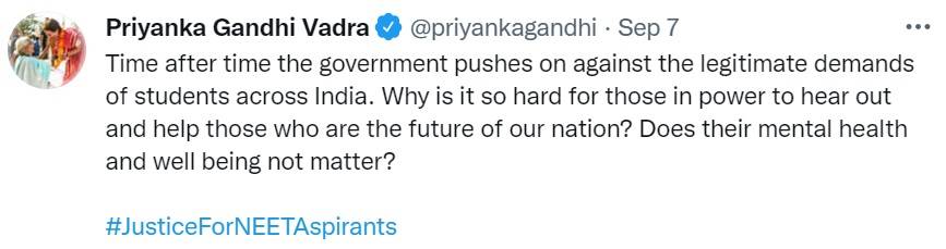 Priyanka Gandhi Vadra also tweeted, "Time after time the government pushes on against the legitimate demands of students across India. Why is it so hard for those in power to hear out and help those who are the future of our nation? Does their mental health and well being not matter?"