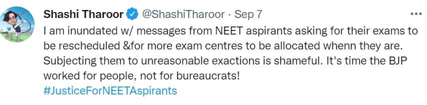 Congress leader Shashi Tharoor tweeted, "I am inundated w/ messages from NEET aspirants asking for their exams to be rescheduled &for more exam centres to be allocated when they are. Subjecting them to unreasonable exactions is shameful. It's time the BJP worked for people, not for bureaucrats!"