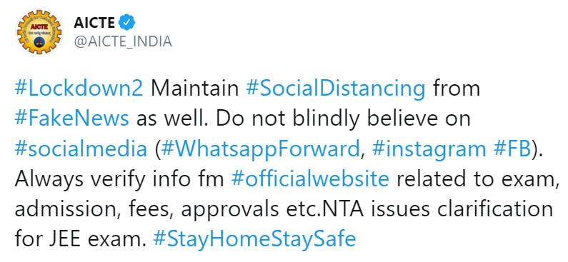 Tweeting the official notice issued by NTA against the fake news, AICTE also advised students not to believe everything that gets circulated on social media.