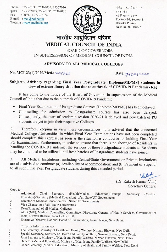 The Medical Council of India has released an advisory for all final year postgraduate medical students around the country regarding the health crisis in the nation due to coronavirus outbreak.