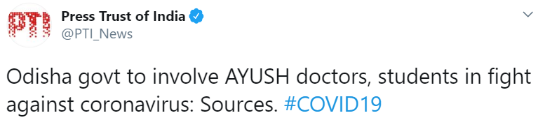 The Odisha government decided to engage 1,620 AYUSH personnel including doctors, post-graduate and under-graduate students in the battle against coronavirus spread in the state. According to the official reports, on April 8, the government stated that the students who are pursuing their undergraduate and postgraduate courses will be involved in the fight to contain the COVID-19 spread.