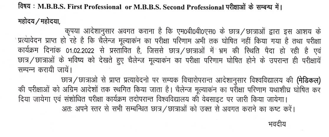 As per the official release, "Challenge evaluation results are not declared up to now and the examination date is proposed on February 1, that is creating confusion among the students and looking at the future of the students, the MBBS examination will be conducted only after announcing challenge evaluation result. The university is postponing the medical examination to a future date and challenge evaluation results will be announced soon and a revised examination schedule will be released on the website."