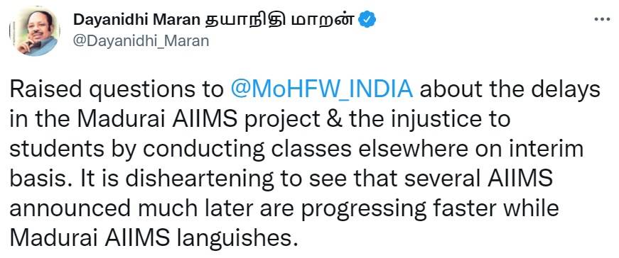 Dayanidhi Maran tweet reads, "Raised questions to @MoHFW_INDIA about the delays in the Madurai AIIMS project & the injustice to students by conducting classes elsewhere on interim basis. It is disheartening to see that several AIIMS announced much later are progressing faster while Madurai AIIMS languishes."