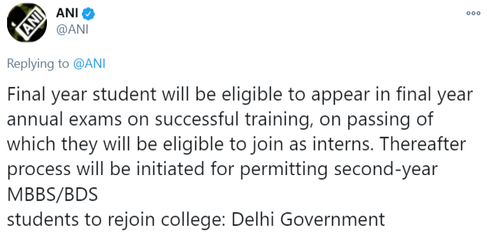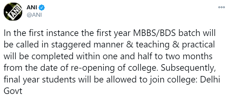 According to the media reports, the Delhi government stated that "in the first instance the first year MBBS/BDS batch will be called in a staggered manner. Teaching and practical will be completed within one and a half to two months from the date of re-opening of college. Subsequently, final year students will be allowed to join college." Check media tweets below: