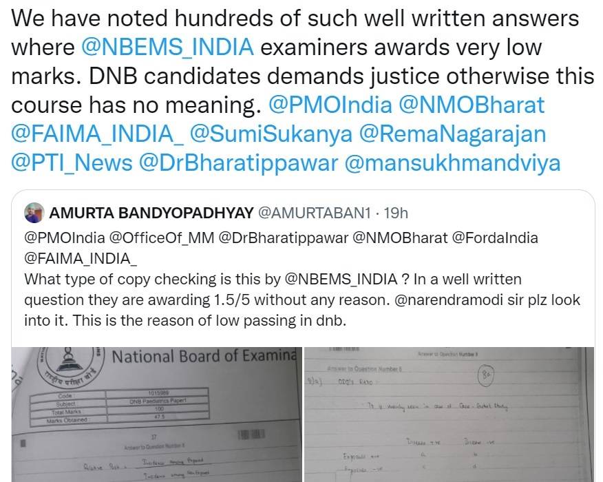 Association of DNB Doctors tweet reads, "We have noted hundreds of such well written answers where @NBEMS_INDIA examiners awards very low marks. DNB candidates demands justice otherwise this course has no meaning. @PMOIndia @NMOBharat @FAIMA_INDIA_ @SumiSukanya @RemaNagarajan @PTI_News @DrBharatippawar @mansukhmandviya"