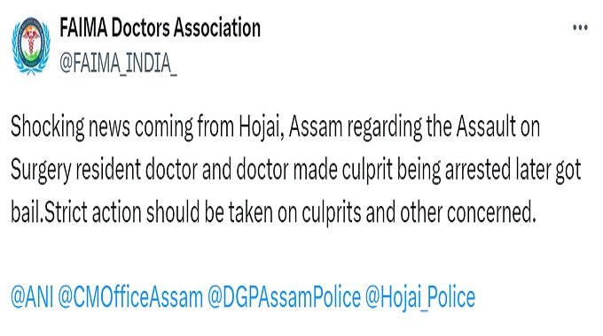FAIMA Doctors Association has also raised this issue and said on the X platform, "Shocking news coming from Hojai, Assam regarding the Assault on Surgery resident doctor and doctor made culprit being arrested later got bail.Strict action should be taken on culprits and other concerned."