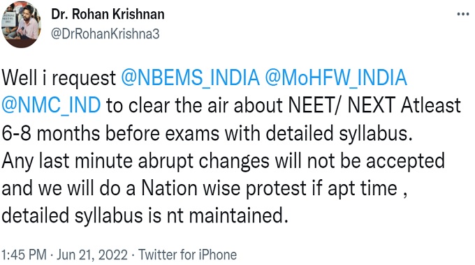 His tweet reads, "Well i request @NBEMS_INDIA @MoHFW_INDIA @NMC_IND to clear the air about NEET/ NEXT Atleast 6-8 months before exams with detailed syllabus. Any last minute abrupt changes will not be accepted and we will do a Nation wise protest if apt time , detailed syllabus is nt maintained."