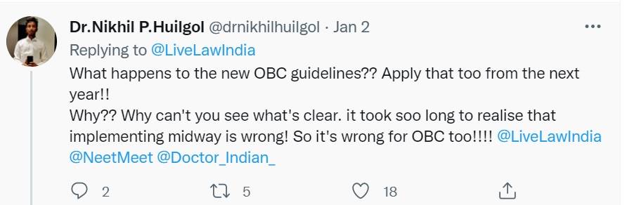 "What happens to the new OBC guidelines?? Apply that too from the next year!!Why?? Why can't you see what's clear. it took soo long to realise that implementing midway is wrong! So it's wrong for OBC too!!!! @LiveLawIndia @NeetMeet @Doctor_Indian_"