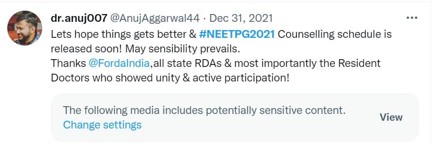 "Lets hope things gets better & #NEETPG2021 Counselling schedule is released soon! May sensibility prevails. Thanks @FordaIndia, all state RDAs & most importantly the Resident Doctors who showed unity & active participation!"