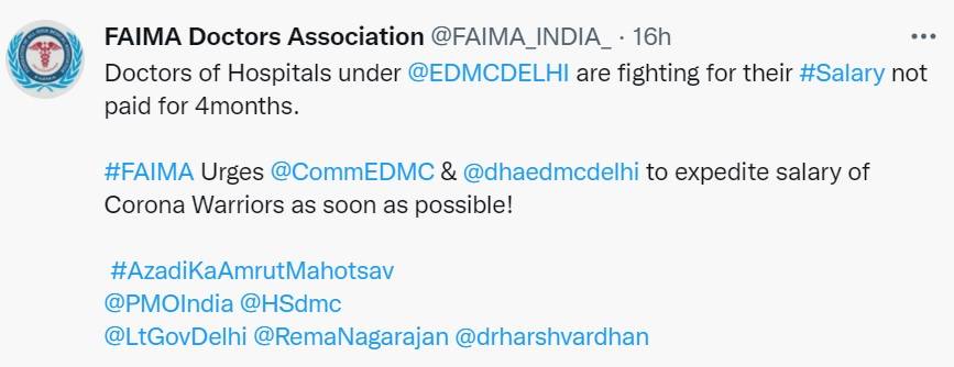 FAIMA Doctors Association has tweeted, "Doctors of Hospitals under @EDMCDELHI are fighting for their #Salary not paid for 4 months. #FAIMA Urges @CommEDMC & @dhaedmcdelhi to expedite salary of Corona Warriors as soon as possible! #AzadiKaAmrutMahotsav @PMOIndia @HSdmc @LtGovDelhi @RemaNagarajan @drharshvardhan"