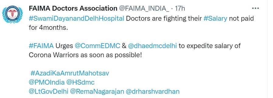 In another tweet, FAIMA said,"#SwamiDayanandDelhHospital Doctors are fighting their #Salary not paid for 4 months. #FAIMA Urges @CommEDMC & @dhaedmcdelhi to expedite salary of Corona Warriors as soon as possible!#AzadiKaAmrutMahotsav @PMOIndia @HSdmc @LtGovDelhi @RemaNagarajan @drharshvardhan"