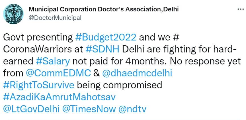 Municipal Corporation Doctor's Association, Delhi, had also tweeted yesterday, "Govt presenting #Budget2022 and we # CoronaWarriors at #SDNH Delhi are fighting for hard-earned #Salary not paid for 4months. No response yet from @CommEDMC & @dhaedmcdelhi #RightToSurvive being compromised #AzadiKaAmrutMahotsav @LtGovDelhi @TimesNow @ndtv"