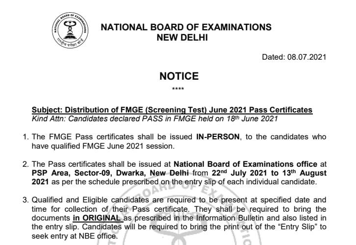 NBE has released the official notification to issued pass certificates to FMGE 2021 qualified candidates. Candidates could collect pass certificates from July 22 till August 13, 2021 from its office. Candidates will have to carry the original documents. Read to know more.