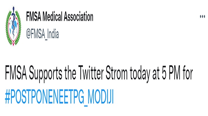 FMSA tweet reads, "FMSA Supports the Twitter Strom today at 5 PM for #POSTPONENEETPG_MODIJI"