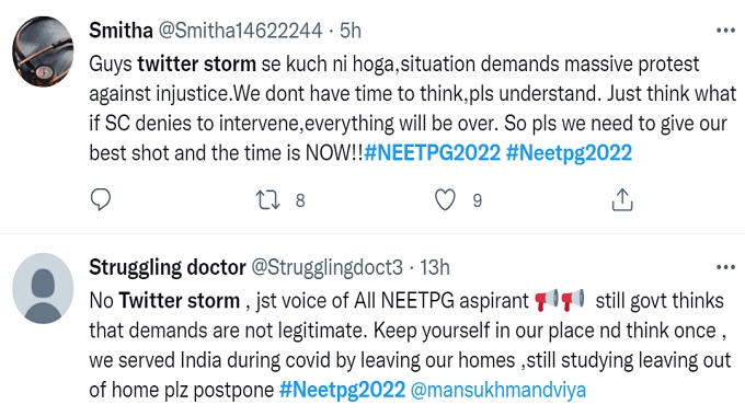 "No Twitter storm , jst voice of All NEETPG aspirant still govt thinks that demands are not legitimate. Keep yourself in our place nd think once , we served India during covid by leaving our homes ,still studying leaving out of home plz postpone #Neetpg2022 @mansukhmandviya"