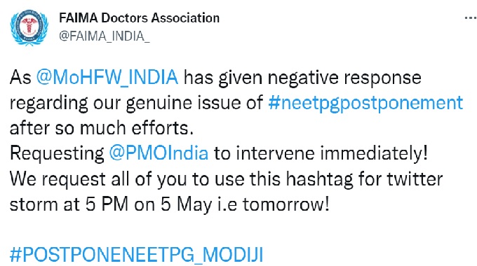 FAIMA tweet reads, "As @MoHFW_INDIA has given negative response regarding our genuine issue of #neetpgpostponement after so much efforts. Requesting @PMOIndia to intervene immediately!We request all of you to use this hashtag for twitter storm at 5 PM on 5 May i.e tomorrow!"
