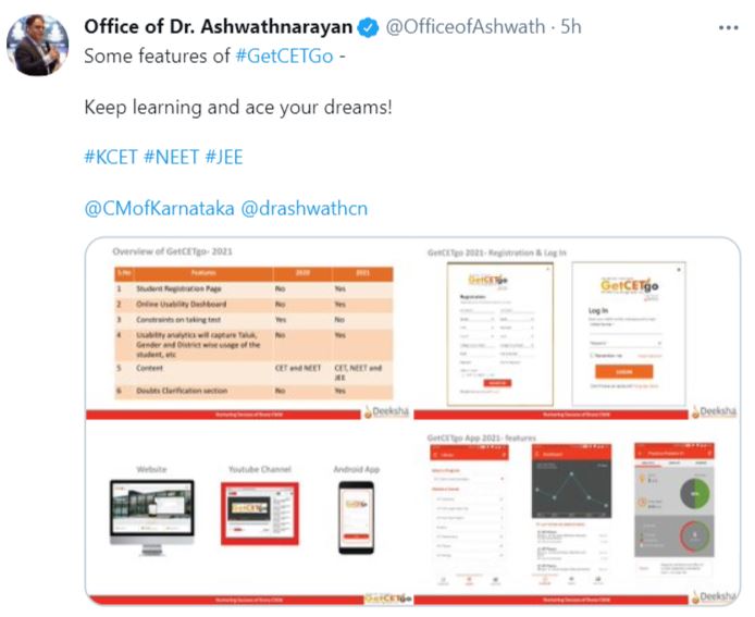 According to the Deputy CM, with this initiative more than two lakh students will be benefitted nationwide who have registered for the program. Students willing to access content designed for JEE, NEET and KCET are required to sign in by providing their personal, academic details. Study material in the form of classwork questions, homework practice questions, synopsis and mock tests is available on GetCETgo. Meanwhile, topic-wise lectures for the entrance exams are hosted on the platform’s official YouTube channel.