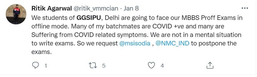 "We students of GGSIPU, Delhi are going to face our MBBS Proff Exams in offline mode. Many of my batchmates are COVID +ve and many are Suffering from COVID related symptoms. We are not in a mental situation to write exams. So we request @msisodia, @NMC_IND to postpone the exams."