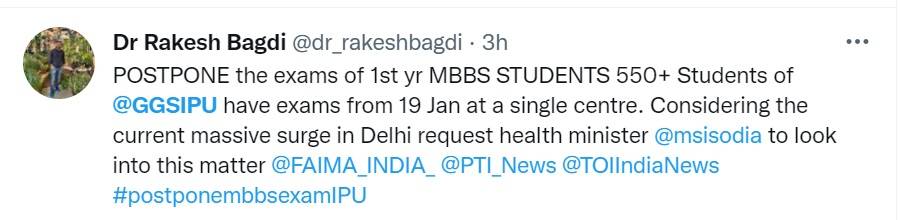 "POSTPONE the exams of 1st yr MBBS STUDENTS 550+ Students of @GGSIPU have exams from 19 Jan at a single centre. Considering the current massive surge in Delhi request health minister @msisodia to look into this matter @FAIMA_INDIA_@PTI_News@TOIIndiaNews#postponembbsexamIPU"