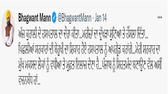 His tweet reads, "Visited Kurali hospital today...Heard the suffering of the patients and gave them courage...We will upgrade the hospital which was a victim of the apathy of the previous governments...The main objective of my government is to provide good and free treatment to the people...We are committed to making Punjab healthy."