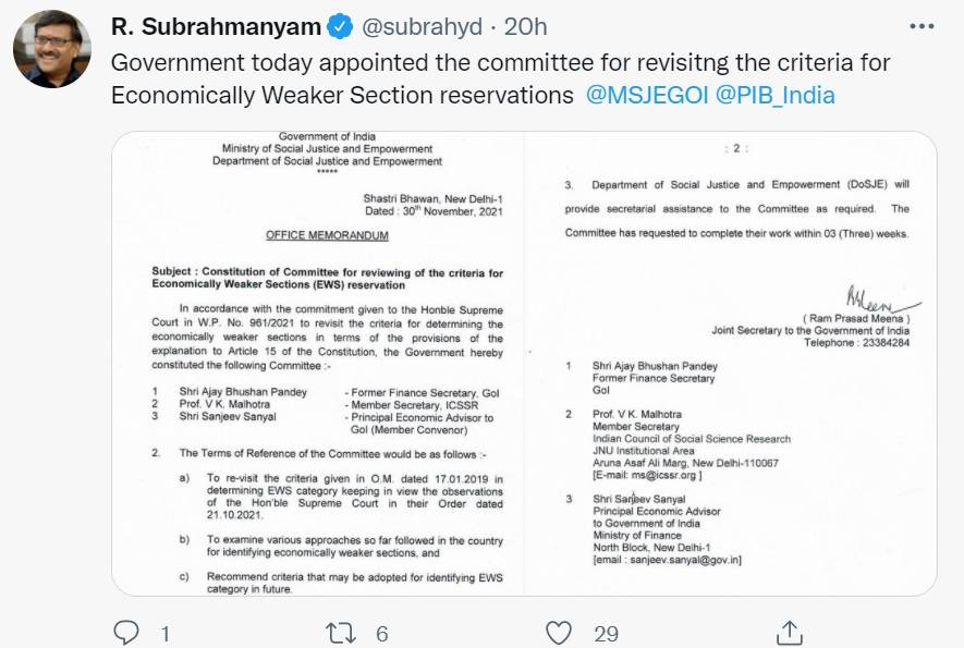 He tweeted, "Government today appointed the committee for revisiting the criteria for Economically Weaker Section reservations @MSJEGOI @PIB_India"