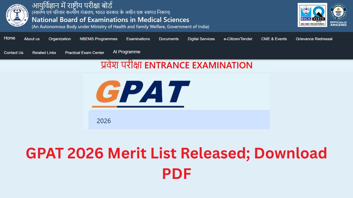 GPAT 2026 Merit List: National Board of Examinations in Medical Sciences has released GPAT merit list today. Candidates who appeared for pharmacy exam can get NBEMS GPAT merit list 2026 download link at natboard.edu.in. It must be noted that no login details are needed to download, as GPAT 2026 merit list has been released in PDF format.Β
