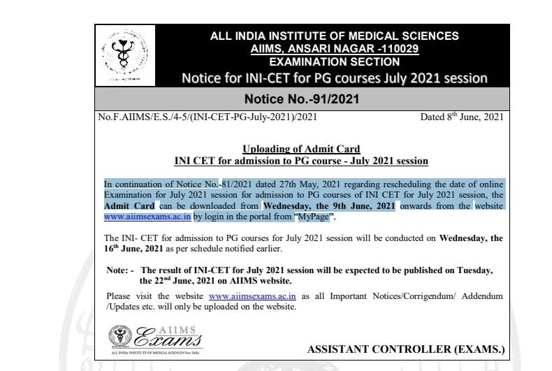 The All India Institute of Medical Sciences has released INI CET 2021 admit card for July session. As per the official notification, admit card for INI CET 2021 exam would be available from June 9 onwards on the official website of AIIMS. Candidates can download INI CET 2021 admit card through registration login details.