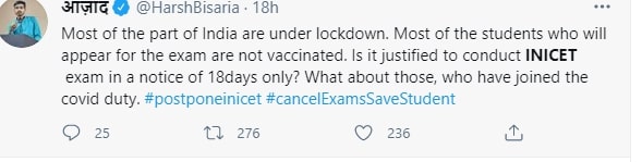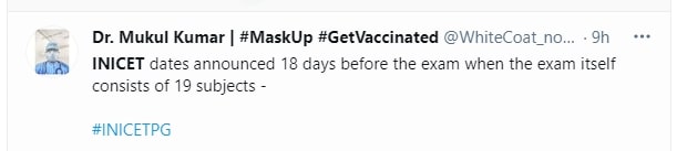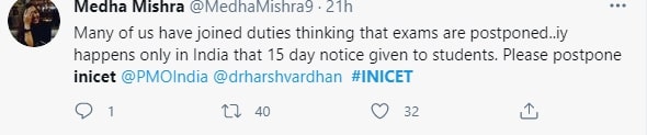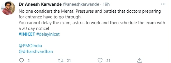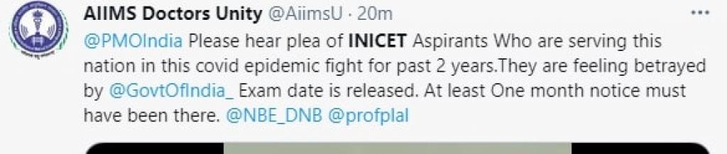 Many of the INI CET candidates believed that the government took the decision in haste and they have not given enough time for the preparation. Taking to Twitter, these students have demanded further postponement of INI CET 2021 dates as giving exams on such short notice will be a tough task for them.
