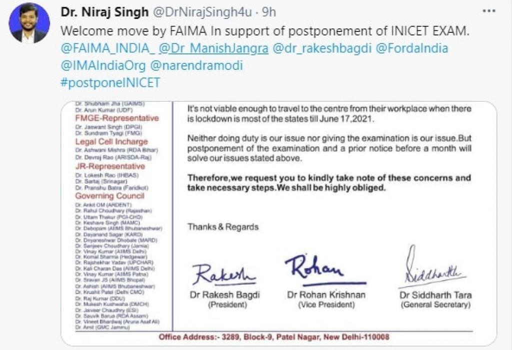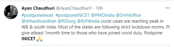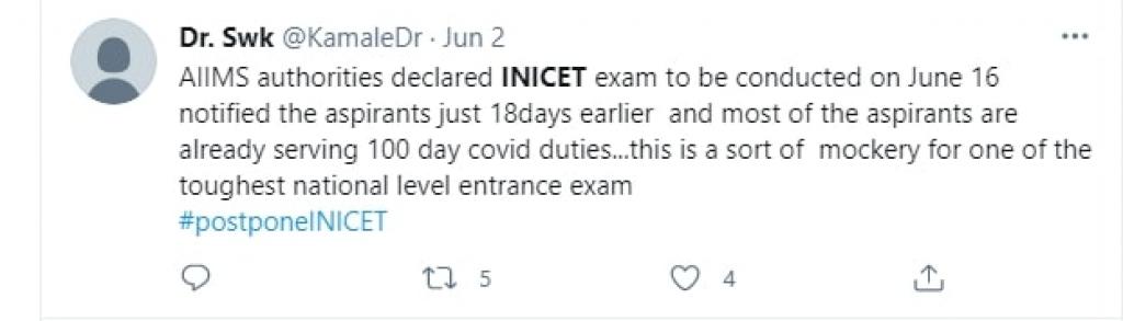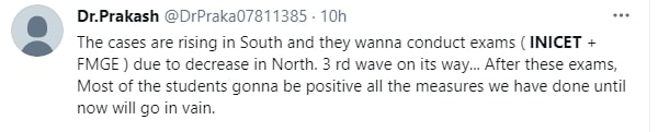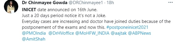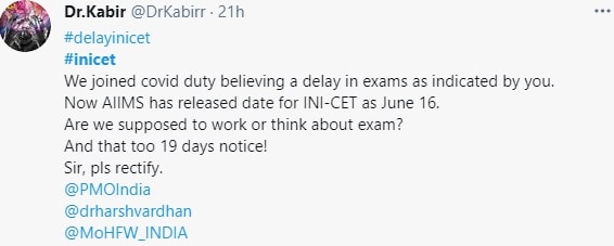 Demanding postponement of the exam, another student said, βThey started working at hospitals after the government asked us due to covid surge now INICET Exam is being conducted with 20 days notice. This is complete betrayal.β