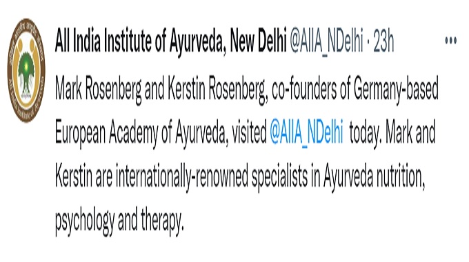 AIIA tweet reads, "Mark Rosenberg and Kerstin Rosenberg, co-founders of Germany-based European Academy of Ayurveda, visited @AIIA_NDelhi today. Mark and Kerstin are internationally-renowned specialists in Ayurveda nutrition, psychology and therapy."